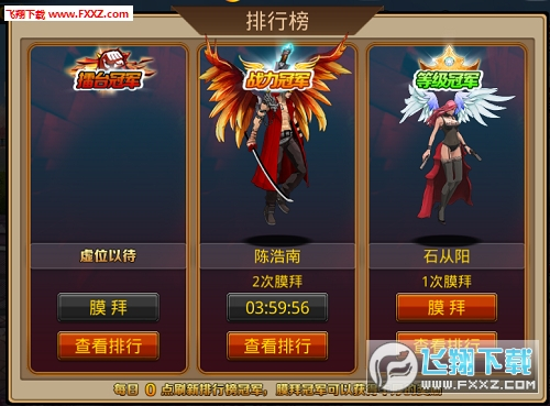 除排行榜冠军外,其他玩家均可对擂台榜、战力榜、等级榜的榜首玩家进行膜拜,每次膜拜间隔4小时,每次膜拜可获得马仔券与钻石奖励,还能得到对方打赏的钻石,且有机会获得大奖。