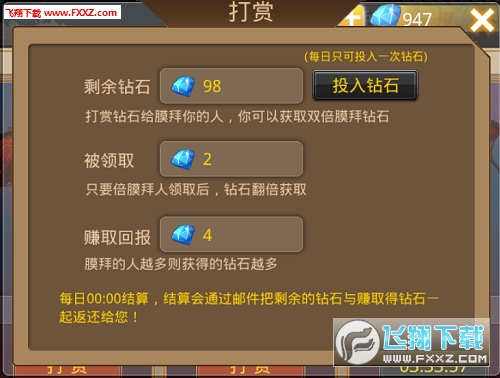 只有在擂台、战力榜、等级榜这三项排名中均位列第一的玩家才有打赏权限,可根据实际情况选择打赏100、200或300钻石;其他玩家通过膜拜行为能够获取打赏奖励,每被其他玩家膜拜一次,你将获得双倍钻石奖励。最终的奖励会在每日0:00进行结算并发放。