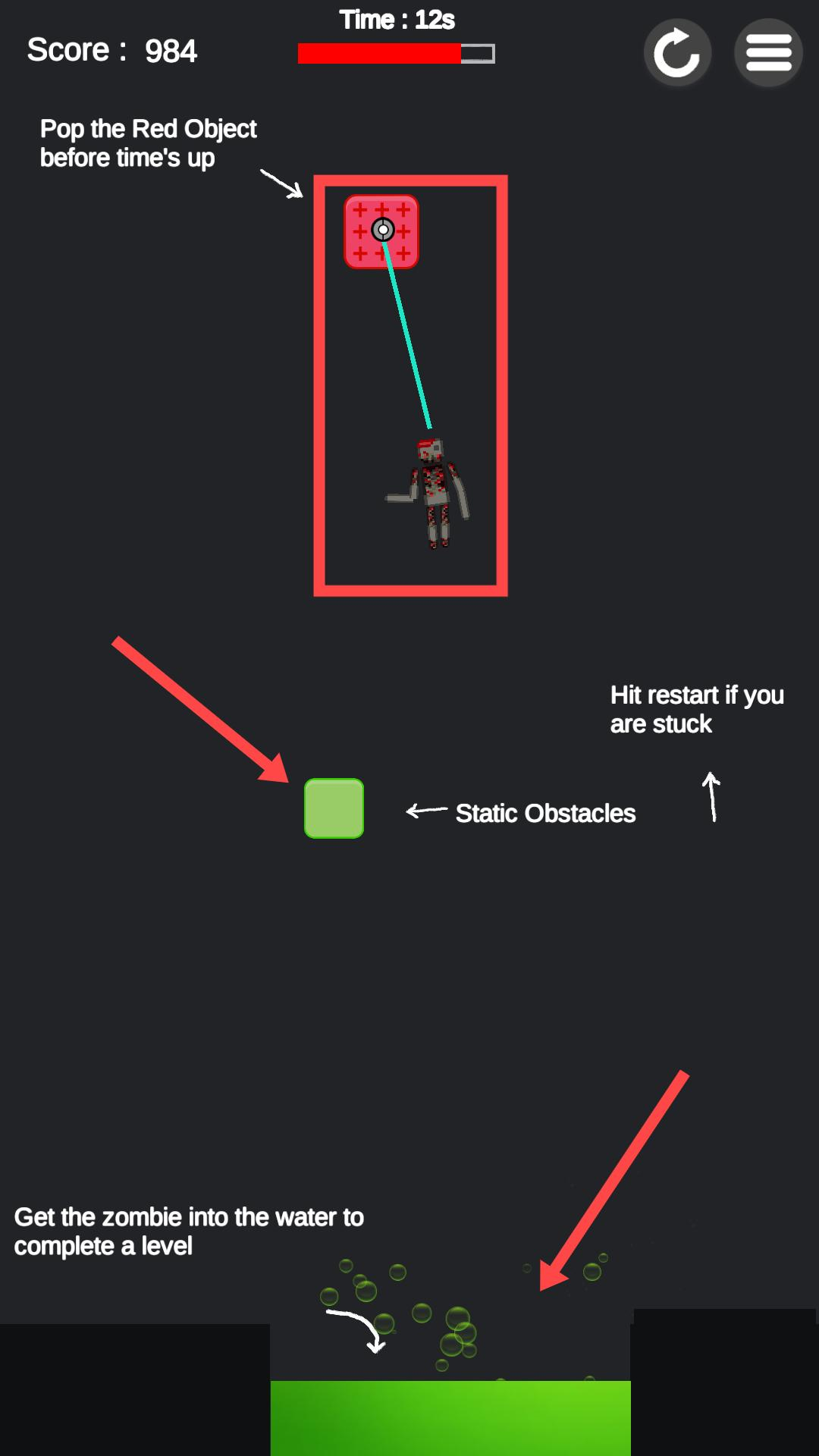 2、限时内先击破红色目标,再引导僵尸避开绿色障碍,落入水底,注意时间与路径规划。
