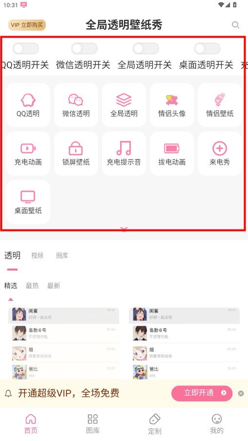 图库中有着很多精美的壁纸可以美化,QQ、微信、桌面等应有尽有