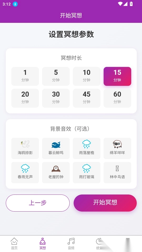 4.设置你的冥想时长和背景音效点击“开始冥想”即可开始你的冥想练习