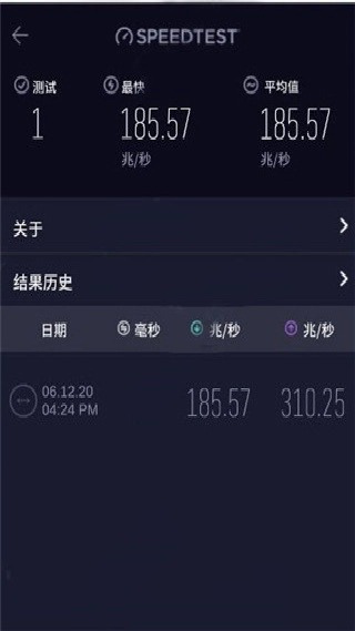 4. 点击首页右上角的三条杠,可看到每次测速结果,测试时间也会显示,颇为方便。